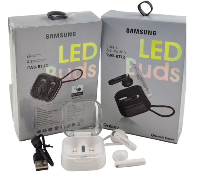 Modelo: TWS-BT12 (LED Buds). Conexión inalámbrica Bluetooth 5.3. Alcance inalámbrico: hasta 10 m en espacios sin obstáculos. Tiempo de carga de los auriculares: aprox. 1,5 h. Tiempo de conversación: aprox. 4 h (según uso y volumen). Tiempo en espera: aprox. 150 h. Entrada del estuche: 5 V – 100 mA. Batería: polímero de litio recargable.